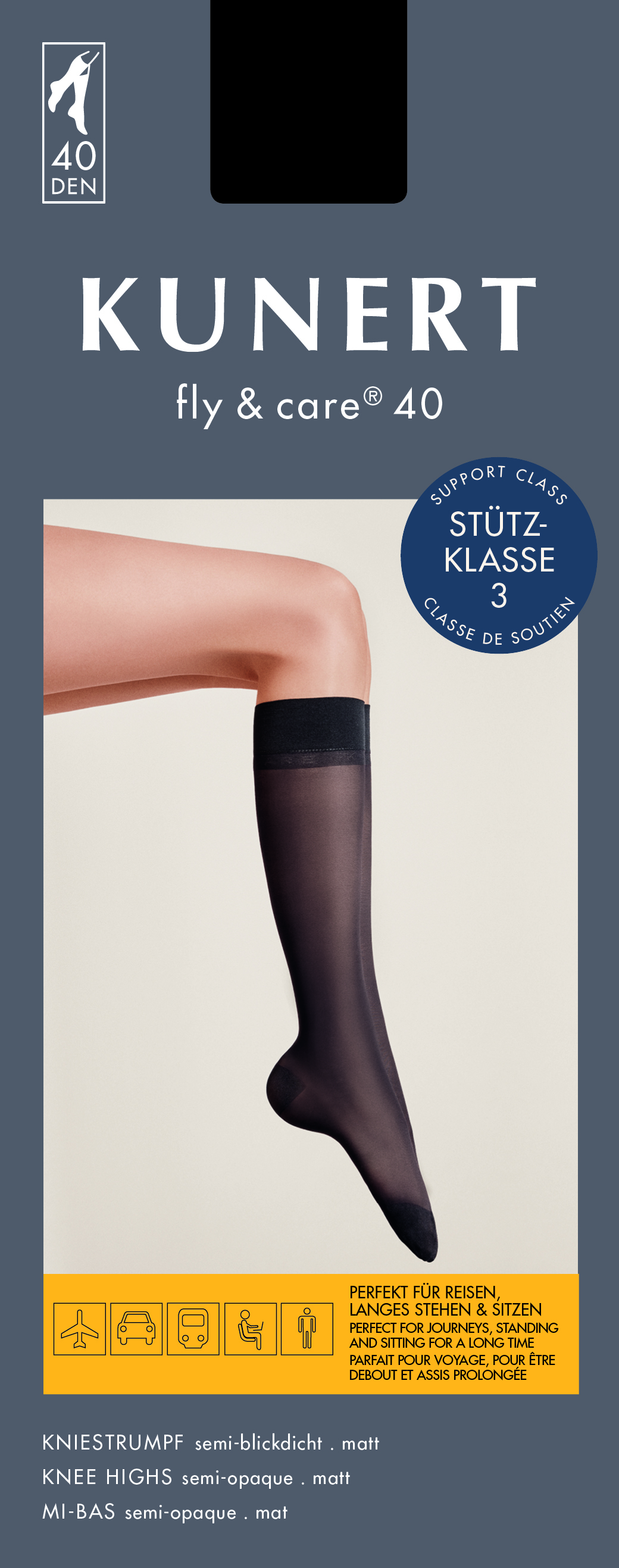 A modern stockings series provides the well-being of your legs up to 24 hours. KUNERT FLY & CARE suitable at work, at home and on a journey. 24H - LEG COMFORT.